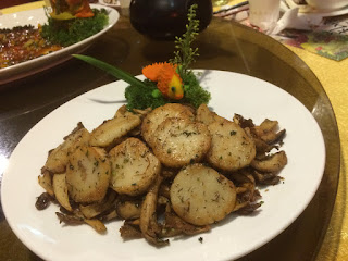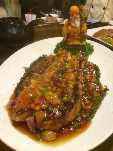 看到這個壽星公造型的裝飾,大家又會想到這是什麼菜式呢?猜不到嗎? 最開始豬豬本人也沒有猜想到,但是後來隱隱約約看到兩條茄子的模樣,才知道這碟是鮮胡椒茄子。