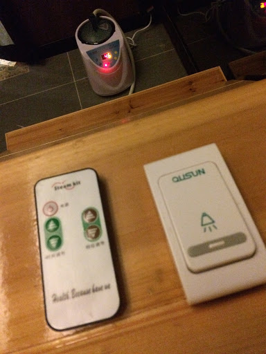 蒸身木箱上有兩個不同的按鈕,一個是蒸薰機的遙控器,讓客人可以在適當的時候自動調節腳底蒸薰溫度,另一個是呼叫服務員的按鈕。